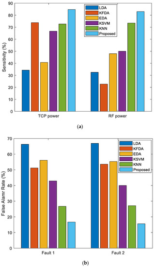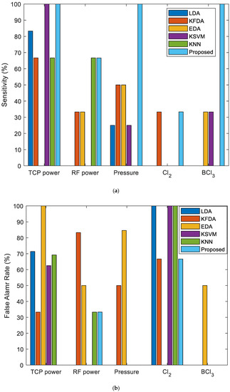 Figure 5 is the comparative evaluation of different fault classification methods on the five types of fault data. As shown in Figure 5a, the proposed method has significantly higher sensitivities to isolate all five fault data types than the other classification methods. Especially, the proposed method using the 57 features has 100% sensitivity in classifying fault types of TCP power, pressure, and BCl3. As shown in Figure 5b, the proposed method has false alarm rates of 0, 33.3%, 0, 66.7%, and 0 to classify the TCP power, RF power, pressure, Cl2, and BCl3. Note, the other classifiers demonstrate 0 false alarm rates for some fault types because they misrecognize the fault data of these fault types.