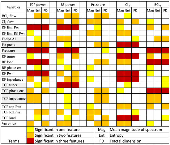In this paper, the feature space consists of 19 Mean magnitudes of the spectrum (Mag), 19 Entropy (Ent), and 19 FD features. Each variable of the fault data has a Mag feature, Ent feature, and FD feature. The significance of these features of the variables composes a fingerprint for each fault type. This fingerprint is the key to the fault identification. As shown in Figure 6, the correlation is marked between variables, extracted features, and fault types as a fingerprint of each fault type for fault identification. Note that all 19-fault data are used to generate Figure 6 for the analysis of fault features. The denser color in the mark indicates that there are more contributions from the corresponding variable for the corresponding fault type. For example, the variable “He press” has all three features marked as the densest color for the fault types “TCP power”, “RF power”, “pressure”, and ”Cl2”, but only one feature is significant for the fault type “Cl3”. These marks explicitly tell which variables are significantly affected by a specific fault type. Such information is critical for fault diagnosis. The densities of the mark color indicate the weight of significance of the variable on the fault type. The proposed feature subspace classification method can be interpreted as a matching of any new fault data to the fingerprint of each fault type, and hence can pinpoint the root cause of a fault—which sensor was reset or faulty in the etch process in this paper.