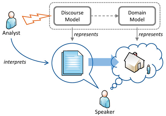 A speaker produces a discourse (centre) referring to a part of the world in their mind (right-hand side). By looking only at the discourse, an analyst creates a discourse model to represent the discourse, plus a domain model to represent the associated domain. Since the discourse refers to the domain (thick arrow, bottom), the discourse model must somehow refer to the domain model (dashed arrow, top).