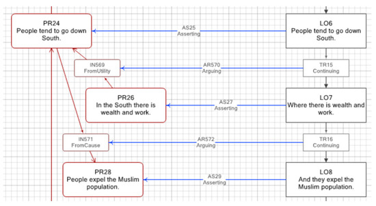 An IAT+ diagram showing the text fragment mentioned above. Locutions are shown as large boxes on the right-hand side, whereas propositions are shown as large boxes on the left. Note that two inferences, labelled IN569 and IN571, indicate how propositions are argumentatively related. The diagram was prepared with LogosLink, a software tool developed by the author.