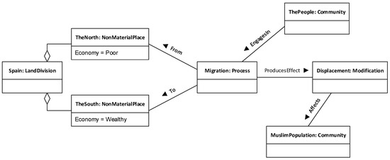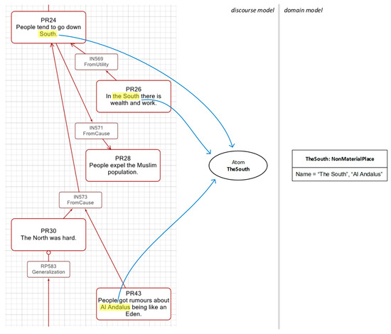 This domain model represents the major things that are explicitly mentioned by the speaker, such as the South or the Muslim population. It also represents other things that do not appear in the text but we know are there, such as the North (which weas mentioned by the speaker in previous locutions), Spain (which the analyst inferred from the context), or the migration process (which is implied by the speaker). All in all, this domain model captures the interpretation that the analyst made of the discourse and can be used as a reference to better understand the discourse model.