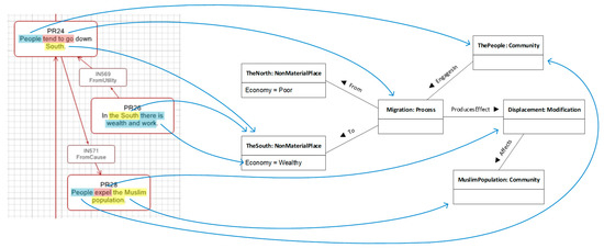 Diagram fragments for the discourse and domain models are displayed here. Blue arrows connecting them stand for the expected connections between elements in the discourse and elements in the domain. Discourse fragments have been highlighted in different shades for clarity. For example, the words “tend to go” in proposition PR24 (top left) must be connected to the Migration: Process entity (centre right).