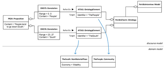 Diagram depicting how ontological proxies work. Above the line, an instance model conforming to the metamodel in Figure 5 is shown, stating that proposition PR24 has two denotations for “People” and “South”. Each denotation refers to a particular ontological element of the discourse model’s associated domain model (ontology). Below the line, a fragment of the associated domain model from Figure 3 is shown. Blue arrows across the line depict the fact that ontological elements work as proxies to elements in the domain model, as shown by the matching identifiers “ThePeople” and “TheSouth”.