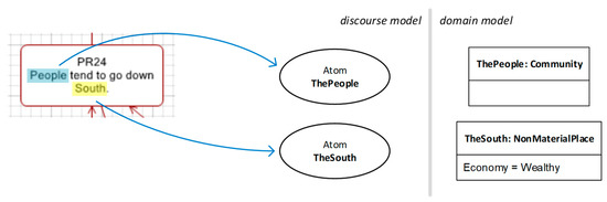 In this example, all the denotations refer to entities in the world. Other propositions may refer to other kinds of ontological elements, such as values or references. For example, PR26 in Figure 4 states that “In the South there is wealth and work”. Here, the fragment “there is wealth and work” can be interpreted as denoting a value for the entity denoted by “the South”, namely the predication that the economy of the South is good (or wealthy, as depicted in the figure).