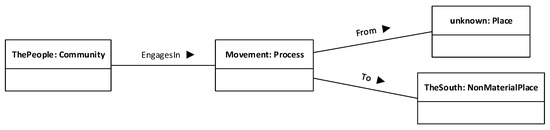 Note that, in the domain model, the source place of the movement is unknown. We show it in the diagram for completeness sake, and because it is likely that the analysis of another proposition in this discourse does refer to it, which would allow us to refine this domain model. The domain model, as is, contains four entities, named by the identifiers ThePeople, Movement and TheSouth plus the keyword unknown. Note also that we have chosen particular categories for these entities: ThePeople is a community, Movement is a Process, TheSouth is a NonMaterialPlace, and the unknown source of the movement is a Place. Other options may be also valid. For example, stating that the people referred to by “People” in the proposition make up a community may be too bold, as we have no guarantee, from the text being analysed, that they in fact do; these people may actually be a scattered collection of groups and families with little or no relation to each other, so we are not justified in categorising them collectively as a community. In this case, we should rather employ a different category such as the non-committal GroupOfPeople. Choosing the right category is not always easy, as often there is not much information in the text about what “right” means in this context. Using a domain-specific reference model or ontology can be useful, as it would offer a catalogue of common concepts in the domain to choose from. For our examples we have used CHARM, the Cultural Heritage Abstract Reference Model [22,23,24], which lists over 200 concepts related to cultural heritage and associated topics plus their properties and relationships.