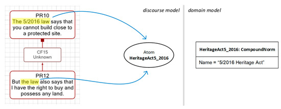Here, two ontological proxies exist, capturing the facts that the 5/2016 Heritage Act is part of a larger set of overall regulations. Once this interpretation has been established, it is clear that there is no necessary conflict between propositions PR10 and PR12, as shown. Note that, in the absence of ontological proxies, the two discourse diagrams (corresponding to the boxes displayed on a grid) from Figure 10 and Figure 11 would show different options but with no associated explanation. A reader of these models would find no information as why a conflict was or was not described between the propositions. Once we incorporate the ontological proxies, however, and even in the absence of the domain model, the interpretation of the discourse becomes clear.