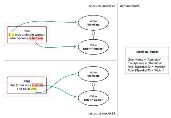 In this example, the denotations “she” in both discourse models point to an atom labelled Mendieta. Both models contain a denotation pointing to a Role value for this atom, but with different contents: model 12 states that Mendieta is a heroine, whereas model 25 states that she is a victim. The domain model is shared between the two discourse models. In it, we can see a single object Mendieta with subjectively marked values for the Role attribute, corresponding to each of the Role values in the discourse models. The modelling of subjectivity is out of the scope of this paper, but a brief introduction can be found in [16]. Essentially, each of the lines starting with “Role” in the Mendieta box in the domain model stands for a value given to this object by a different agent, namely, our speakers 12 and 35. In this manner, two discourse models that were in principle disconnected and structurally unrelated are linked together through a common domain model that documents the associated speaker perspectives. This captures the fact that both discourses are referring to a common set of concepts in the world. This example only involves two discourse models, but this approach can be applied with any number of discourse models as long as all of them refer to a common set of things in the world.