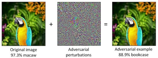 However, many researchers [,,] have shown that DNNs are vulnerable to adversarial attacks. Adversarial attacks lead DNNs into making incorrect predictions easily by adding small, well-crafted perturbations to the original image. These perturbations are generated by calculating the gradient of the input image to the network, called adversarial perturbations. The images with adversarial perturbations, known as adversarial examples. Figure 1 shows the process of adversarial attacks. Adversarial examples not only exist in digital images but also the physical world [,,,,]. Adversarial attacks lead to security threats in real-world applications of DNNs. Therefore, to deal with the threat of adversarial examples has become a major concern in the safety of DNNs.