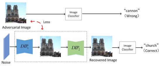 The main idea of t-DIPs. The first network DIP captures the main information of the image. The second network DIP generates the corresponding clean image based on the output of network DIP. The two DIP networks set the loss function as minimizing the difference of recovery image and adversarial example.