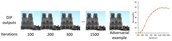 where x is the adversarial example, z is the input random noise, represents the network DIP with parameters , is the number of iterations which is determined by experiments.