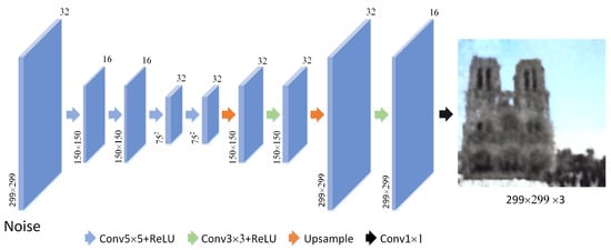 The second DIP network which we note as DIP recovers the target image from the output of DIP. It should be a high-capacity network. So we design the second DIP network shown in Figure 5. The DIP network can be seen as two components, a feedforward path and a feedback path. The first part feedforward path consists of two convolutional layers and five ‘unetDown’ blocks which each of them is composed of two convolutional layers and a max-pooling layer. The second part feedback path consists of five ‘uetUp’ blocks and a convolutional layer. Each block consists of a deconvolutional layer and two convolutional layers. The ReLU non-linearity is used as an activation function. There are shortcuts between ‘unetDown’ blocks and corresponding ‘uetUp’ blocks. These shortcuts transmit multi-scale information contained in the images. Thus, DIP can generate images with better details in the later stage of iteration.
