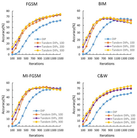 The classification accuracy of Inception-v3 on adversarial images generated by four attacks. The blue line represents the accuracy of Inception-v3 with DIP for defense.