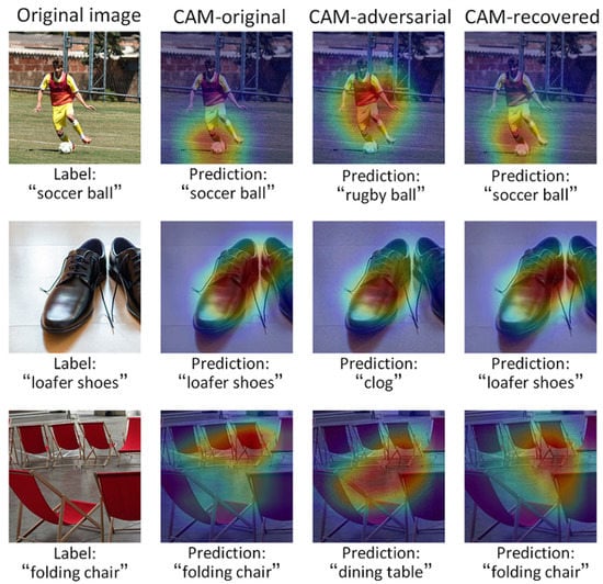 To explore the nature of the proposed method we use localization techniques, termed Class Activation Maps (CAMs) []. CAM enables convolutional neural networks with global average pooling to localize the discriminative regions in the image. This method allows us to visualize the predicted class scores on a given image. In CAM, the red highlighted area means the area which network focus on. The features of this area have a greater weight on the network’s prediction. Figure 8 shows the CAMs for the top-1 prediction of Inception-v3 model for original, adversarial and recovered images. It can be seen that the network focus on the areas where soccer, shoes, and chair are located in original images. Thus, the network can predict correctly. However, for adversarial examples, adversarial perturbations make the network focus on the wrong regions, resulting in a wrong prediction. The CAMs of recovered images are closer to the CAMs of the original images. It is indicated that the proposed method is effective in keeping the original image content and suppressing adversarial perturbations.