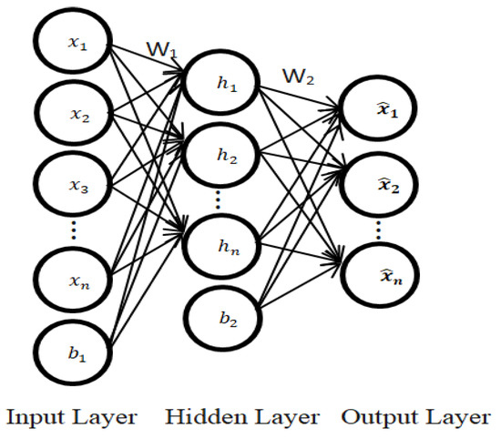 The sparse autoencoder (SAE) is an unsupervised learning method which is used to automatically learn features from unlabeled data [14]. In this type of autoencoder, the training criterion involves a sparsity penalty. Generally, the loss function of an SAE is constructed by penalizing activations within the hidden layers. For any particular sample, the network is encouraged to learn an encoding by activating only a small number of nodes. By introducing sparsity constraints on the network, such as limiting the number of hidden units, the algorithm can learn better relationships from the data [18]. An autoencoder consists of two functions: an encoder and decoder function. The encoder maps the d-dimensional input data to obtain a hidden representation. In contrast, the decoder maps the hidden representation back to a d-dimensional vector that is as close as possible to the encoder input [12,19]. Assuming denotes the input features and represents the neurons of the hidden layer, the encoding and decoding process can be represented with the following equations: