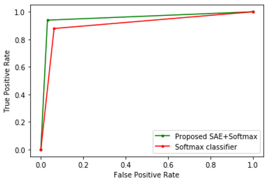 The training parameters of the SAE include: , and number of epochs = 200. The hyperparameters of the Softmax classifier include learning rate = 0.01, number of samples in mini batches = 32, momentum value = 0.9, and number of epochs = 200. These parameters were obtained from the literature [12,23], as they have led to optimal performance in diverse neural network applications.