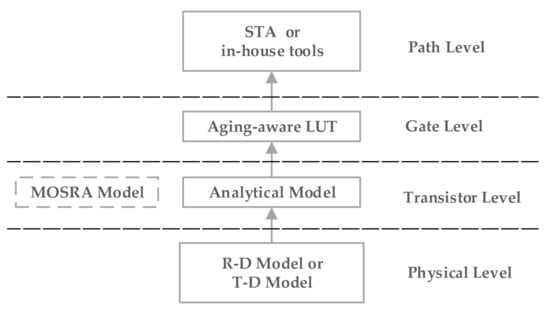 MOSRA is the built-in aging model integrated into Synopsys HSPICE, which can be used to predict the long-term reliability and performance of the circuit. Recently, MOSRA was deployed in many studies for reliability simulation and circuit design using the Synopsis HSPICE platform [17,18,19]. It should be noted that the MOSRA model itself is also constructed on the basis of a specific NBTI analytic model.