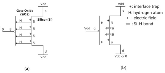 Two prevalent physical mechanisms, reaction–diffusion (R–D) [10,11] and trapping–detrapping (T–D) [12], have been proposed in the literature to explain NBTI. Because T–D has not been fully proven, the R–D model is widely used to interpret the NBTI mechanisms [13]. According to the R–D model, in conventional pMOS, due to crystal mismatch at the Si–SiO2 interface, traps are present in the form of Si dangling bonds after the growth of gate oxide. Positive interface traps are generated due to disintegration of silicon–hydrogen (Si–H) bonds and one H atom that can diffuse away from the interface under negative bias conditions, as shown in Figure 2a. As a result, the threshold voltage increases and the pMOS transistor becomes slower and fails to meet timing constraints. Once the stress is removed, the H near the Si/SiO2 interface will anneal the broken Si-bonds, as shown in Figure 2b, where two interface traps disappear, leading to a partial recovery of the degradation. The amount of recovery is highly related to the frequency, duty cycle, the magnitude of bias change, etc.