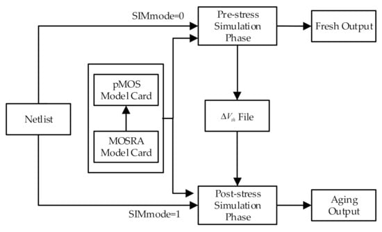 Here, it is useful to briefly review how degradation is calculated by the MOSRA model. The working of MOSRA takes place in two phases, i.e., the pre- and post-stress simulation phases [20,21]. The pre-stress simulation phase is also known as the fresh simulation phase, where the electrical stress of every user-selected metal oxide semiconductor field effect transistor (MOSFET) is computed by HSPICE on the basis of the circuit behavior and the built-in MOSRA models. Then, the post-stress simulation phase is executed. The post-stress simulation simulates the degradation effect on the circuit performance on the basis of the result attained from the pre-stress simulation. After that, the result of the circuit performance is obtained, such as the circuit delay.