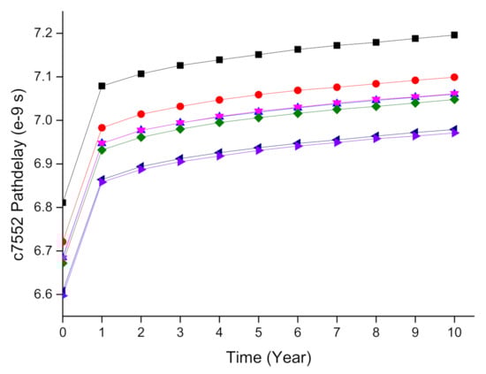 In order to study the aging characteristics of the circuit and find the hidden rules, sufficient experiments were implemented on the basis of ISCAS’85, ISCAS’89, and ITC’99 benchmark circuits. The MOSRA model was applied to a certain number of worst-case path candidates from c7552 within ISCAS’85 for aging-aware delay degradation over 10 years in time steps of 1 year at a temperature of 400 K. The HSPICE simulation results are shown in Figure 4. For each curve, 11 time points, including the fresh time at time = 0, are marked on the horizontal axis. The vertical axis represents the aged delay corresponding to each time point. The detailed experimental process can be found in Section 4.