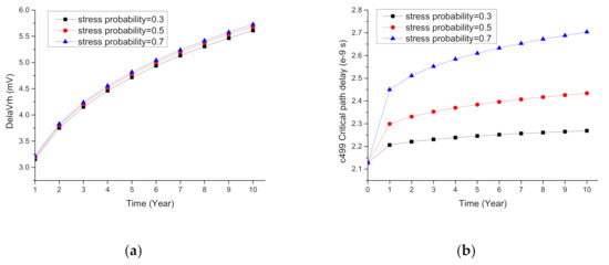 Taking the critical path from c499 as an example, the relationship among the of one pMOS, the path delay, and the NBTI stress probability is shown in Figure 7. It can be seen that the and path delay increased as the stress probability increased due to the overall stress time increasing. This conclusion also applied to the critical paths from c6288 and c7552.