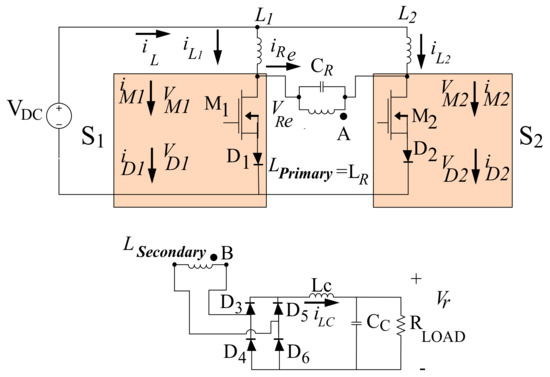 The topology shown in Figure 1 is comprised of four stages: the first stage consists of two current sources (L1 and L2) and a DC voltage source (VDC), the second stage by a parallel resonant tank (LPrimary and CR) with magnetic isolation derived by LPrimary, where LPrimary is coupled to LSecondary (from part A to B), the third stage by a full-wave rectifier (D3–D6), and the fourth stage by the decoupling elements (Cc and Lc). The operation of the circuit is as follows: the two inductors L1 and L2 provide the two current sources to the parallel resonant tank, the unidirectional switches S1 and S2 short-circuit the current sources periodically in order to feed the parallel resonant tank formed by the transformer (composed by LPrimary and LSecondary) and the resonant capacitor CR with a square current waveform. The parallel resonant tank filters this waveform and applies a sinusoidal voltage waveform to the full-bridge rectifier (D3, D4, D5 and D6). The rectified signal is filtered by LC and CC and it is applied to the load (RLOAD). One important characteristic of the CFRC (Figure 1) is the need to have an overlapped control, because if there is no overlapping control between M1 and M2, the inductance (L1) would be charged by the current iL1 (t), and the current iL2 (t) from the second inductance (L2) would flow directly through the resonant tank. Under the dual condition, iL1 (t) would flow through the resonant tank and iL2 (t) through L2. However, if there is no overlapped control, iL1 (t) and iL2 (t) could be canceled, although not completely, producing a considerable increase in the losses on the unidirectional switches. Furthermore, the resonant tank and the components used need to be carefully selected, since these parameters directly affect the overlap signals in S1 and S2. Additionally, the high frequency transformer is a critical part of the resonant converter. Its design affects efficiency, weight, and dimension of the whole topology. This fact is important to improve the efficiency of the topology. Considering these statements, a brief comparison of different semiconductor devices should be performed. As a result of the advancement in the field of power semiconductor technologies [37,38,39], SiC MOSFETs, SiC junction gate field-effect transistors (JFETs), SiC Schottky barrier diodes, and gallium nitride (GaN) transistors provide a valuable opportunity to obtain high efficient performance with compact size. Part of the primary characteristics in all power semiconductor devices are related to the operating at high power, high frequency, and high temperature. In fact, many works have been reported in the literature analyzing the physical breakdown mechanisms, modeling, characterizations, and the trade-off characteristics between the breakdown voltage and the on-resistance of Si, SiC, and GaN-based power semiconductor devices [40,41,42,43]. As a result of these studies, some characteristics are shown in Table 1.