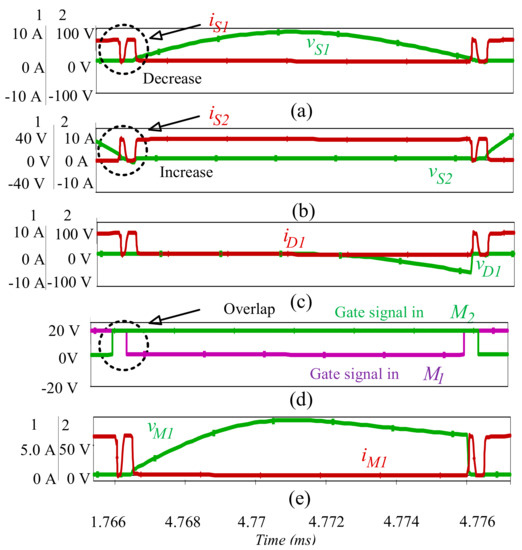From Figure 2, when the overlap begins (gate-signal in M1 and gate-signal in M2 are in the on-state), the current iS1 decreases to zero, and the current iS2 increases. This behavior is related to the charge and discharge of the internal stray capacitances of D1 and D2.