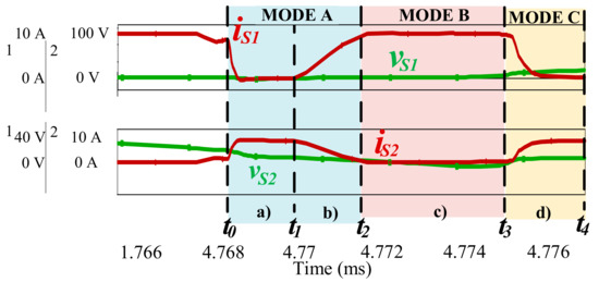 In this sense, when S2 is in the on-state, M2 can be modeled by its output parasitic capacitance in parallel with its parasitic resistance, and D2 as a parallel made up of the same diode and its stray capacitance. Furthermore, Figure 3 shows the hard switching in D1 and M1 caused by the effect given by the overlap. In this manner, to determine the converter performance effects, based on Figure 3, three modes are proposed considering the current and voltage waveforms of S1 and S2; therefore, the first mode (MODE A from t0 to t2) performs a fall-rise of is1 and a rise-fall of is2, the second mode (MODE B from t2 to t3) represents the time when is1 keeps its value and is2 is zero, and the third mode (MODE C from t3 to t4) represents the dual condition of MODE B.