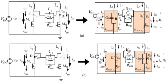Time t0-t1 (Figure 4a): this time starts when the gate-signal in M2 is in the on-state, thereby the overlap starts. During this time, iS1 decreases to zero (and remains at 0 A) and iS2 increases its value the same as the input current (IL). Moreover, since S2 is in the on-state, the diode D1 can be modeled as a parallel by the same diode and its stray capacitance CD1, and M1 by a drain-source resistance RDSON M1. In this moment, the voltage of the stray capacitance in D1 (VCD1) can be represented as shown in Equation (1).