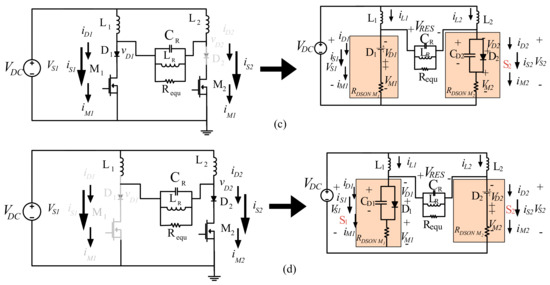Time t3–t4: MODE C starts (Figure 4d), the gate-signal in M1 is in the off-state, and thus the overlap is finished. Furthermore, M2 is in the on-state and is2 is increasing. During this time, S1 is in the off-state after finishing the discharging process, which causes the stored energy to be lost not only in M2 but also in D2. Additionally, as a result of M1 in the off-state, VRES will be split in D1 and M1 with a complementary voltage in D2. In fact, VCD2 can be modeled as shown in Equation (3).