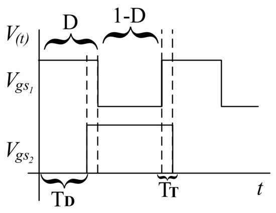 From Figure 5, D is the applied duty cycle, the time delay between the gate-signals of M1 and M2 (VGSM1 and VGSM2), and represents the overlap time when M1 and M2 are in the on-state. As mentioned, TT is defined in Equation (4) and TD is defined in Equation (5).