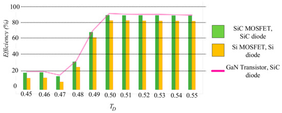 According to Figure 6 and considering TD = 0.5, a global efficiency and total power losses (switching plus conduction) in S1 plus S2 of 86% and 27 W were performed by the Si-MOSFET and Si-diode combination. Furthermore, SiC-MOSFET plus SiC-diode performed an efficiency and power losses in S1 plus S2 of 92.7% and 14 W, respectively. Finally, the performance given by the combination of GaN-transistor plus SiC-diode were similar to the combination of SiC-MOSFET plus SiC-diode with an efficiency of 94% and power losses in S1 plus S2 of 11 W.