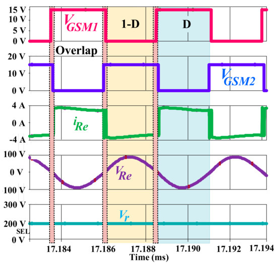 The capacity to achieve high switching frequency in every semiconductor is directly proportional to its drag-velocity. The speeds present in GaN devices are more than twice the speed in Si components, achieving commutations at much higher frequencies. However, a negative characteristic by GaN devices in comparison with Si and SiC is less thermal conductivity [44,45,46], which means the heat generation of SiC devices can be easily dissipated as compared to GaN. From the previous characteristics, one of the key behaviors to compare with these power devices in a CFRC is the overlap stage control. In this way, a brief study of this condition is presented below.