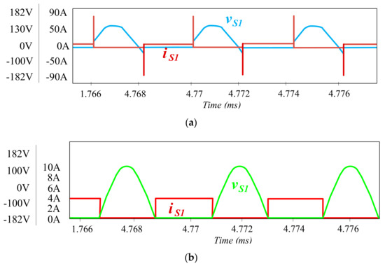 Signals: (a) current and voltage on S1 with a non-overlapped control, (b) current and voltage on S1 with an overlapped control.