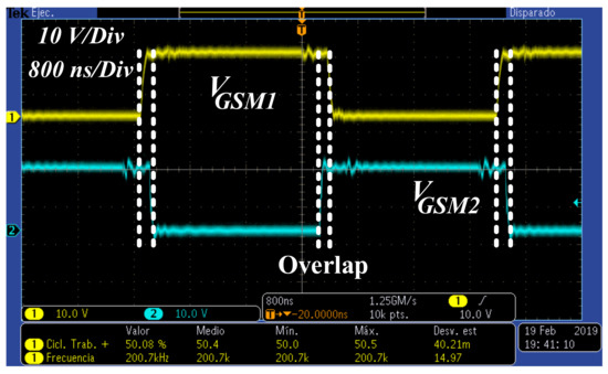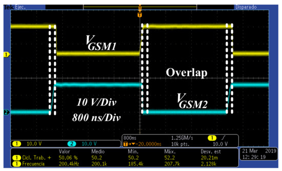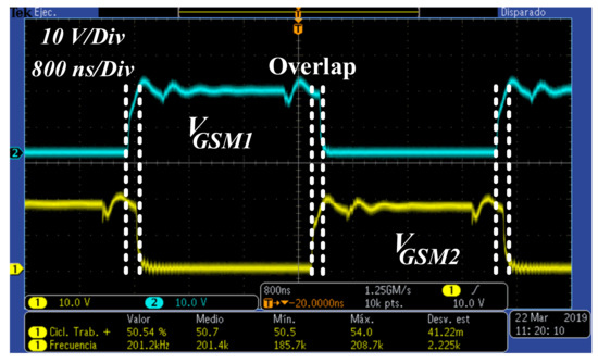 In this way, to have a good relation overlap-efficiency, an important point to consider is to work with an overlapped control to have optimal conditions, as shown in Figure 8b. Furthermore, Figure 8b shows less power losses as a result of the less current peaks obtained in comparison with the non-overlapped behavior presented in Figure 8a.