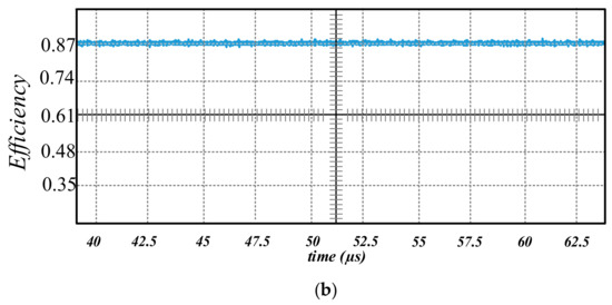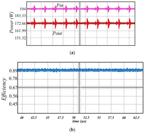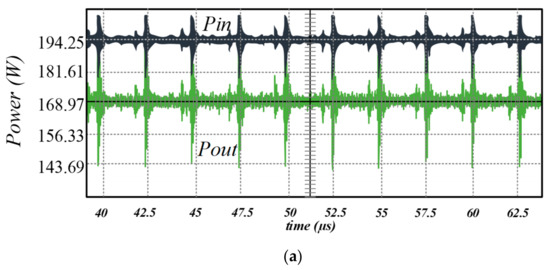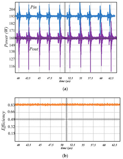 Additionally, it is well-known that Si power devices present a greater variation of non-linearity behavior of the output capacitance, whereas the low voltage part of the output capacitance increases due to higher area specific density. The high voltage part of the output capacitance decreases with the area shrink factor of the device, increasing the power losses and consequently affecting the overall performance of the converter. In this way, there is a need to study the performance given by new power devices technologies that permit a reduction of the high voltage part of the output capacitance leads to significant lower energy values being stored in it, because turning off Si devices with lossless would require to turn off the channel current before the voltage significantly rises across the device. The shape of the output capacitance, being charged by the full load current, will determine the voltage waveform. Conversely, the gain in the energy stored in the output capacitance, being dissipated as heat in hard switching applications during turn-on, is hence correlated to an increase of switching frequency. On the other hand, the overlapped signal in Figure 10 shows an operation frequency of ≈200 kHz, considering a duty cycle of 50%. In contrast, another important parameter is to determine the electrical efficiency; therefore, Figure 11a shows the input (Pin) and output power (Pout) as well as the efficiency (Figure 11b) obtained in the implemented topology.