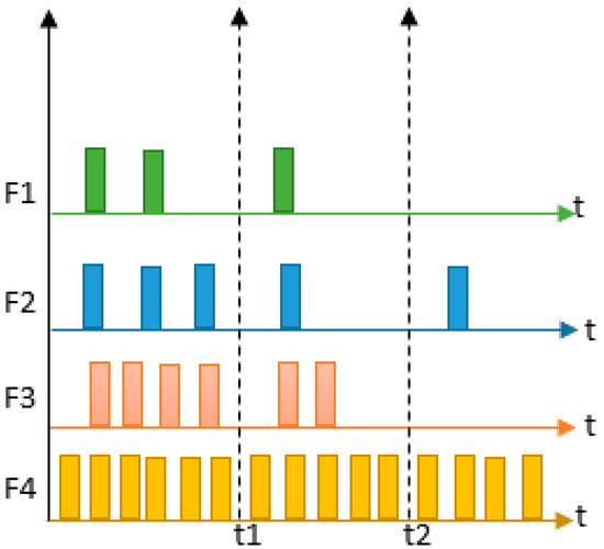 Open flow configures flow table entries with idle and hard timeout across the flows [9]. These timeouts are used to control the life span of flow entries in the switch flow table. When the time elapses, the flow entry is removed to free spaces for new incoming entry. An idle timeout removes the correspondent entries after an inactive period with no packet to match that entry, while a hard timeout removes the corresponding flow entry after a deterministic lifetime of the entry, regardless of whether it has been matched or otherwise. In the conventional method, the SDN controller configured flow entries with the fixed idle or hard timeout value across the flows without considering the variabilities exhibited by the flows and usage of the flow table [9]. The work of [7,9] is an example of such a strategy under a specific condition and application, respectively. This method could be effective with better performance when the traffic flows are fixed and flow table space is sufficient. However, assigning the same timeout value results in the inefficient utilization of switch flow table memory because it may be too long for short lived flows or too short for large long lived flows [10]. As such, this exhibits a trade-off between the short and large timeout value. The former may prematurely evict a flow entry before the arrival of the next packet while the latter may cause a larger flow table than necessary [10]. Consequently, it causes the switch to controller communication overhead by the sending of a packet-in message to the controller when the next packet arrives. Conversely, a longer timeout reduces premature evictions, but come at a cost of flow table occupancy [10]. A larger timeout value lengthens the flow entry lifetime even though there is no packet expected to match that entry. For example, in Figure 1, the small square shapes represent the number of packets that have been transmitted for each flow (F) until time t1, t2. F1 represents a short flow with a small number of packets at both t1 and t2, while F2 shows long flow with a small number of packets and F3 illustrates short flow with a large number of packets. Finally, F4 has a long flow with large packets.