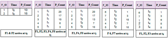 When the flow table is full to its capacity, OpenFlow allows the provision of an eviction mechanism to recover the memory space occupied by less important or inactive rules [6]. To enable eviction in OpenFlow, one can learn from the conventional rule replacement used in computer memory management. When the flow table of switches is not enough to accommodate new flows, the SDN controller uses first-in-first-out (FIFO), random, and least recently used (LRU) concepts to actively remove less important or inactive rules like in the work of [14,15]. A prior study by Zarek et al. [16] verified that LRU outperformed the other eviction method with better performance in terms of hit ratio. However, the main challenges with all the eviction methods were deciding on the right rule to evict. FIFO, on the one hand, is an ineffective eviction method because generally, there are many flow processed packets in a short period of time. As such, FIFO has a tendency to preserve a rule for processing less frequently to stay for a longer period with a low hit ratio, occupying a precious space. Another way is to remove flows randomly, but one can attest that the method can remove rules that correspond to the active flows. This problem is not peculiar to FIFO and random alone, as LRU is not an exception as well. Suppose 200 different flows arrived at the switch with a different number of packets each at a slight time interval (t). The switch flow table space is less than the number of arrived flows, assuming the available space is for 100 flow entries. In this situation, the eviction mechanism is enabled to evict 100 less important entries. Figure 2 illustrates the processing of inefficient eviction methods. F_ID represents the unique ID of each flow, and time shows the matching time of entry, P_count represents the number of packets corresponding to each flow. Suppose at time t0 2 flows F1 and F2 arrive at the switch with 10 and 16 packets, respectively. Among the flows, there are delay-sensitive and best-effort flows. Delay sensitive flows include multimedia flow such as video or voice and the best effort is like email and other web traffic flows. Assuming delay-sensitive flows are frequently used, this type of flow needs to be prioritized because of the nature of their stringent delay requirement. Flow F1 and F2 represent delay-sensitive flows. At time t1, 10 more packets arrive from flow F1, one more packet arrives from flow F2 and three flows arrived (F3–F5) with 10, 6, and 3 packets respectively. Assuming a proactive approach is used, a match is performed, and action is taken accordingly without consulting the controller. Similarly, at time t2, more packets belonging to F3–F5 arrive. However, at time t3, two flows—F6 and F7—arrive. Unfortunately, the flow table is already full to its capacity, thus, some flows have to make way for the newly arrived flows. Assuming two flows are needed to be evicted, applying the LRU scheme in this scenario caused flow F1 and F2 to be the victims. It is important to note that, the number of packets determined an important flow entry. F1 has the highest number of packets followed by F2. Therefore, at time t4, the previously removed F1 and F2 arrive. In this situation, the switch must trigger a packet-in event to request for corresponding entries. Consequently, besides the communication overhead, packets belonging to F1 and F2 must suffer another processing delay and thus this affects the system quality of service (QoS).