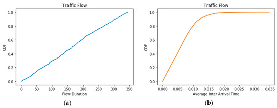 It could be observed that the duration of flows differs greatly and ranges from a minimum value of 1 s to a maximum of 350 s. The size of flows is mostly defined by the packets count fixed threshold value. The work of [23] classifies flows (e.g., 1–2 packets as small; 2–10 packets as a medium; and more than 10 packets as large flow). Therefore, considering that it is unknown whether there will be a second packet when the first packets of the flow arrives, a small idle timeout is sufficient for small flows, which will significantly reduce the flow table occupancy and overhead. A larger hard timeout is quite enough for a larger flow to ensure that the flow is never removed during packet transmission. In addition, the large timeout can also prevent multiple flow requests for large flows with longer duration. For the inter-arrival time, as explained previously, the conventional fixed timeout value across flows may not fit with the flow behaviour. One of the greatest problems is that for the flow inter-arrival time, as illustrated in Figure 3b, different flows exhibit different inter-arrival time. More than 70% of the flows are having an inter-arrival timeout of 0.010. Configuring flows with the fixed value may cause a large flow installation request which in turn generates high communication overhead. Therefore, in the proposed design, this shortcoming is overcome with an adaptive small value for every first flow. This will help to study the behaviour of new flows, as flows that repeat more often their timeout are adjusted accordingly.