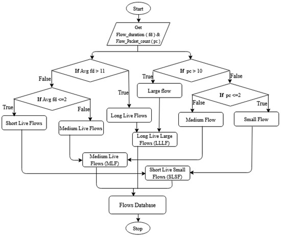 FCMM aims to record the accurate flows statistical information and resource usage in recent times with minimal overhead. This information will be used to return an appropriate hybrid and adaptive timeout value to different flow behaviours. In addition, when the flow table is full of its capacity, such information will help in deciding the right flows to evict. OpenFlow protocol provides extensive built-in data flow statistics collection to support different applications. One can leverage on EventOFPAggregateStats, an event trigger feature provided by the Ryu controller using a thread monitor mechanism to collect the statistic of data flow in the switch flow table at a different time interval. However, when a flow lasts longer than the statistics polling interval, obtaining such statistics at the regular interval required an extra processing load. This process can potentially be resource-intensive for the SDN controller and introduce another scalability concern especially when the traffic flows increased and the number of switches to be monitored increases as well. Experimentally, it has been observed that when the flow idle timeout value (t FIT) is smaller than the polling monitoring interval, this results in a number of packet-in events due to the miss-entry of short lived flows (SLF). Alternatively, the flow idle timeout value (t FIT) may be set to a value greater than the polling monitoring interval (PMI). However, when the flow idle value (t FIT) is greater than the PMI value, it results in potential flow table occupancy longer than necessary by long lived flow (LLF) with few or no packets. On the other hand, when the PMI value is short, then it increased the communication overhead between the switch controller, which in turn defeats the objective of the proposed solution. Therefore, completely depending on the controller to pull the data of total active flows to obtain the usage of the flow table may not be the best solution. Thus, the proposed design does not completely depend on the polling flow statistic to obtain flow information. Instead, three statistical data were introduced to relieve the overhead for setting timeout values and flow eviction: AH-IHTA uses two different sources of information to decide on the appropriate timeout value: a database is maintained in the FCM module, which maintains the information of the active flows in every switch. When the SDN controller receives a packet-in event, a corresponding FlowMod is sent to install an entry. Once a flow is installed, it will be stored in the database using the following format {(dpid, cookie): (idle and hard timeout): (match, time)}. dpid identifies the switch and cookie is the unique value to identify each flow, whilst the idle timeout for each entry and total hard timeout are recorded. The matching header field and the timestamp when an entry is installed are also recorded. This database module will not only reduce the overhead due to the frequent polling statistic counter but will also help the controller to process a new packet-in event much faster. A capacity threshold value is used to obtain the number of active entries with least overhead. This way, the current flow table utilization is obtained through the proportion of total active entries at sampling time. The FlowRemoved flag was configured to obtain the number of packets corresponding to a particular flow and its duration. The duration and packets_count is used to check the flow volume for proper categorization as illustrated in Figure 5. Based on average flow duration, if the duration of flow f is greater than 11 s and the packet_count is greater than 10, such a flow is categorized as a long lived large flow (LLLF). When the average duration is less than 2 s and the packet_count is also less than 2, then it is categorized as short lived small flow (SLSF). The remaining flows whose average duration is within 2–11, with more than two packets but less than 10, are categorized as medium lived flows (MLF). The time interval difference of two consecutive flows can be extracted from the time recorded in the flow database. The packets matching period between these flows is used to categorize the flow packet inter-arrival time (PIAT). The matching period represents the packet inter-arrival time belonging to the same flow. represents the time interval between the first and last packet of the flow. Therefore, when a new packet matches an existing entry, the time is recorded as (ti), and the maximum flow waiting time is denoted as .