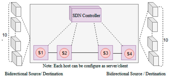 Simple network topology was employed to test and evaluate the proposed solution as illustrated in Figure 6. Iperf utility is considered as a traffic test mechanism to generate TCP and UDP data packets with various networking parameters such as bandwidth, interval, and protocol. One host is configured as a server, as traffic is generated between the server and clients. Different instances were considered, firstly, single TCP and UDP traffic at the reporting interval of 10 s with a total test duration of 30 s were generated. Secondly, parallel connections were made with 10 hosts lasting for 30 s. On average, the packets are generated with a size of 50 bytes. Afterward, the result was captured to study and analyse. 1. The number of packets in a messages event due to flow idle and hard timeout. 2. The eviction mechanism, for which flows are evicted due to the flow table capacity threshold.