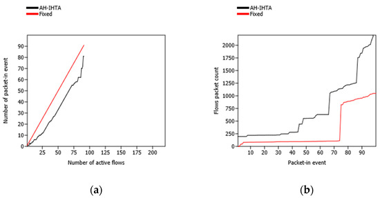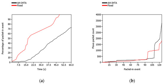 The number of flow generations was increased, and the flow table size was also increased to accommodate 2000 flows. Figure 8a shows the percentage of packet-in generation events generated per minute due to the flow set up request. The static mechanism showed an upward trend with an average 68% packet-in generation within 30 s while AH-IHTA has lower packet-in generation on average 28%. Therefore, this result verifies that AH-IHTA has better performance in terms of lower packet-in generation. Similarly, in Figure 8b, it was observed during the simulation that five of the hosts send heavy-load packets flows to another host. In this situation, the static timeout mechanism prematurely expired the timeout for those flow entries and therefore, prioritized the flow with few packets. AH-IHTA considers packet the count before setting an appropriate timeout value, as flows with large packets are given priority. This is to ensure that flows with few packets never occupy the precious flow table space. Therefore, AH-IHTA has better flow table utilization.