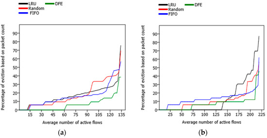 From Figure 9a, it can be observed that LRU evictions were close to 78%, random 70%, FIFO close to 60%, and the proposed DFE 39%, based on the flow packets count. This way, LRU has the highest number of flow eviction, a high large number of packets followed by random and coming down to FIFO. The proposed solution has a lower number of evictions. Thus, the conventional eviction mechanism will be expensive for delay-sensitive applications. In addition, they can further incur a high processing load because of the frequent premature eviction of active flows. The result is further verified in Figure 9b by increasing the number of traffic flow generations and increasing the flow table size. LRU evictions were close to 88%, random 58%, FIFO 62%, and DFE 47%. In both the scenarios, the proposed DFE had a lower percentage of eviction based on the flow packet counts compared to the existing method.