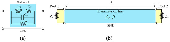 Figure 5a shows the experimental setup for the measurement of S-parameters of the prototype solenoid. The two red dashed lines indicate the electrical reference plane where the VNA is calibrated, and the two-port SOLT (short-open-load-thru) calibration was used for this measurement. The first interface from the solenoid was simplified to be modeled as a single wire above a conducting plane. The second interface to the VNA was modeled as a coaxial cable, as described in Figure 5b. The characteristic impedance of a single wire and coaxial cable can be effectively approximated as in Equations (12) and (13), respectively [23].