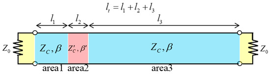 A local permittivity-degraded area in a winding can be modeled by a finite line with different electrical characteristics. Figure 2 shows a transmission line consisting of the following three sectionalized parts: area 1 (length l1, characteristic impedance ZC, and phase constant β) and area 3 (length l3, characteristic impedance ZC and phase constant β) are in a healthy state, and area 2 (length l2, characteristic impedance Z’C and phase constant β’) indicates the degraded part. That is, the pink area in the diagram indicates area 2, where the insulator locally deteriorates with the prime symbols. The total ABCD parameter with ‘t’ in the superscript can be calculated by multiplying three ABCD matrices in sequence as Equation (1) [17].