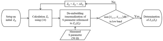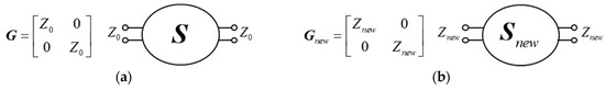 Figure 3 shows the concept of changing the termination impedance of an S-parameter. Figure 3a shows the S-parameter obtained from the measurement equipment, which is referenced to Z0, and Figure 3b shows the renormalized S-parameter when terminated with Znew. Basically, the S-parameter is one of the network parameters, which is dependent on the reference (termination) impedance, but the Z-parameter is not changed by the termination impedance. The relationship between those two parameters is expressed in Equations (9a) and (9b), where G and F are the termination impedance matrix and the real part of them, respectively, and I is the identity matrix. The star is for the conjugate of complex value. In Equation (9a), S is expressed in terms of Z, and Z is expressed in terms of S, in Equation (9b).