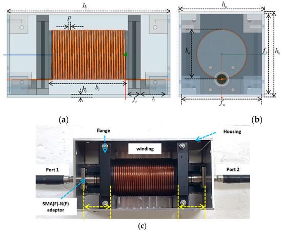 Detailed geometries of the solenoid with its size are described in Figure 4 and Table 1, respectively. The prototype solenoid has one layer to easily locate the additional ring-type insulators, and the whole solenoid is placed in a metal housing to mimic the real solenoid valve and to also keep the high-frequency signals clean. Figure 4c shows a picture of the manufactured solenoid prototype with RF cables connected at both sides. At both ends of the windings, wires are extended to touch N-type (F) to SMA (F) adaptor, connecting VNA. The yellow dashed lines in Figure 4c indicates the interface part between the solenoid and RF cable, which should be de-embedded for the extraction of solenoid’s characteristic from the measurement data.