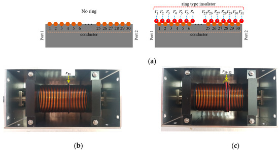 In the fabricated solenoid, sheath rubber rings with relative permittivity of 2–3 were employed between the turns in the prototype solenoid. Table 2 shows the number of rings and their locations on the solenoid. For one ring, all of the 31 locations were used one by one, and for two rings, location r3–4, r9–10, r15–16, r21–22, r27–28, r3,29 were used for installation, and so on. Note that the last one (r3,29) indicates the two rings are separately located at r3 and r29 (the red color in Table 2), while the others are consecutively installed. The number of rings and their locations in Table 2 imply both the level of effective permittivity and the scatteredness of the degradation in the insulator.