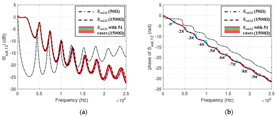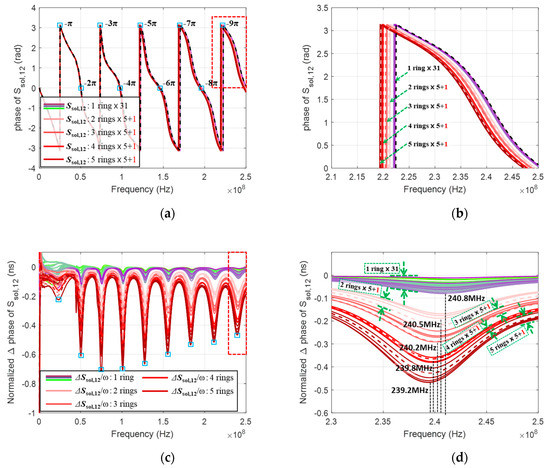 Figure 8 shows the magnitude and phase of the transmission S-parameter, Ssol,12, of the single-layered solenoid. One can find that the transmission characteristic has been significantly enhanced with 1500 Ω reference impedance as compared with 50 Ω reference impedance; for Ssol,12 with 1500 Ω reference impedance, the magnitude increases significantly in the low-frequency range up to ~100 MHz, and the phase decreases more linearly than Ssol,12 with 50 Ω reference impedance. This could suggest that the characteristic impedance of the single-layered solenoid would be close to 1500 Ω, not to 50 Ω in this specific frequency range up to 100 MHz. After ~100 MHz, the magnitude of Ssol,12 decreases more, but the phase keeps linearity up to ~250 MHz, as seen in Figure 8b. The Ssol,12 signals with degraded insulator (51 1–5 rings) are also shown in Figure 8 with 1500 Ω reference in various colors. Nevertheless, it is observed that the Ssol,12 signals are overlapped and become a thick trace, where it is not easy to identify each line. To identify the traces more clearly, the phase difference in Ssol,12, between the healthy and degraded solenoids, was calculated using Equation (8). Figure 9a shows the phase of Ssol,12 with 1500 Ω reference impedance, which has been wrapped between −π and π, and the nine points for the multiples of −π are indicated as sky blue colored squares. It can be seen that the curves get thicker as the frequency increases, which means that the differences are getting larger as the frequency increases.