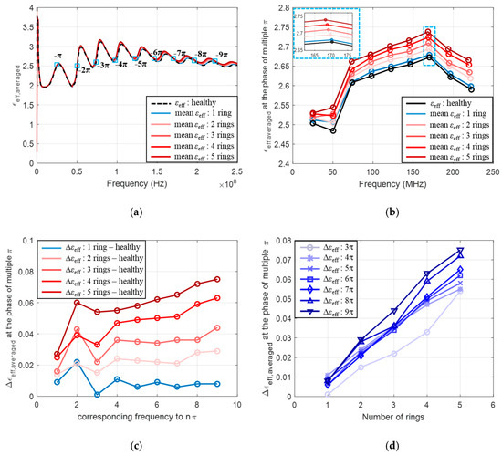 (a) Calculated average effective permittivity for healthy and 1–5 rings installed using Equation (16); (b) Calculated average effective permittivity at the multiples of π; (c) Incremental (difference) average effective permittivity at the multiples of π; (d) Incremental (difference) average effective permittivity as the number of rings increases.