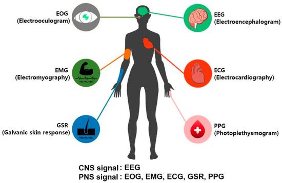With the rapid development of deep learning technology in emotion recognition, research is actively being conducted to classify emotions by combining biosignals other than EEG. As shown in Figure 1, the central nervous system (CNS) signal refers to the EEG signal generated from the brain. The peripheral nervous system (PNS) signals can be observed using electrooculogram (EOG), electromyogram (EMG), photoplethysmogram (PPG), and galvanic skin response (GSR), which indicate the electrical signals generated through muscle movements and eye movements. The EEG is the most critical signal for internal emotion recognition. Nevertheless, severe artifacts can result from data acquisition, noise, temperature, and individual differences because EEG signals are very susceptible. The PNS signals can be generalized differently than the EEG signal. Research often uses PNS signals as an aid because it is challenging to classify emotions using only EEG signals. One study [29] used the heart rate information obtained from an electrocardiogram (ECG) to recognize emotion by assessing the facial muscle movement through an EMG signal. Another survey [30] measured facial expressions through the tail muscles to read the changes in emotion. In those studies, the EEG signals use the PSD features. Few studies have defined useful features other than PSD for emotion recognition.